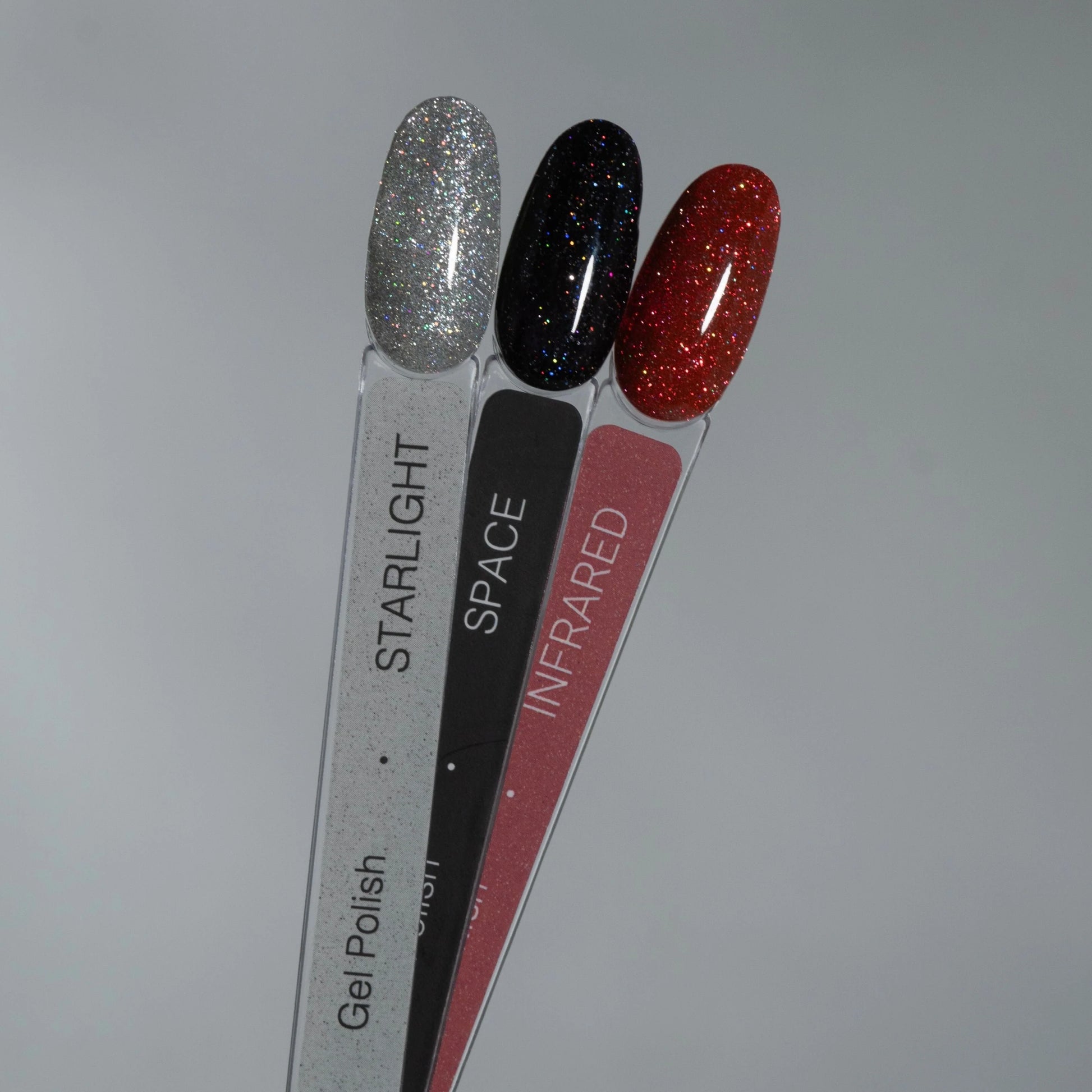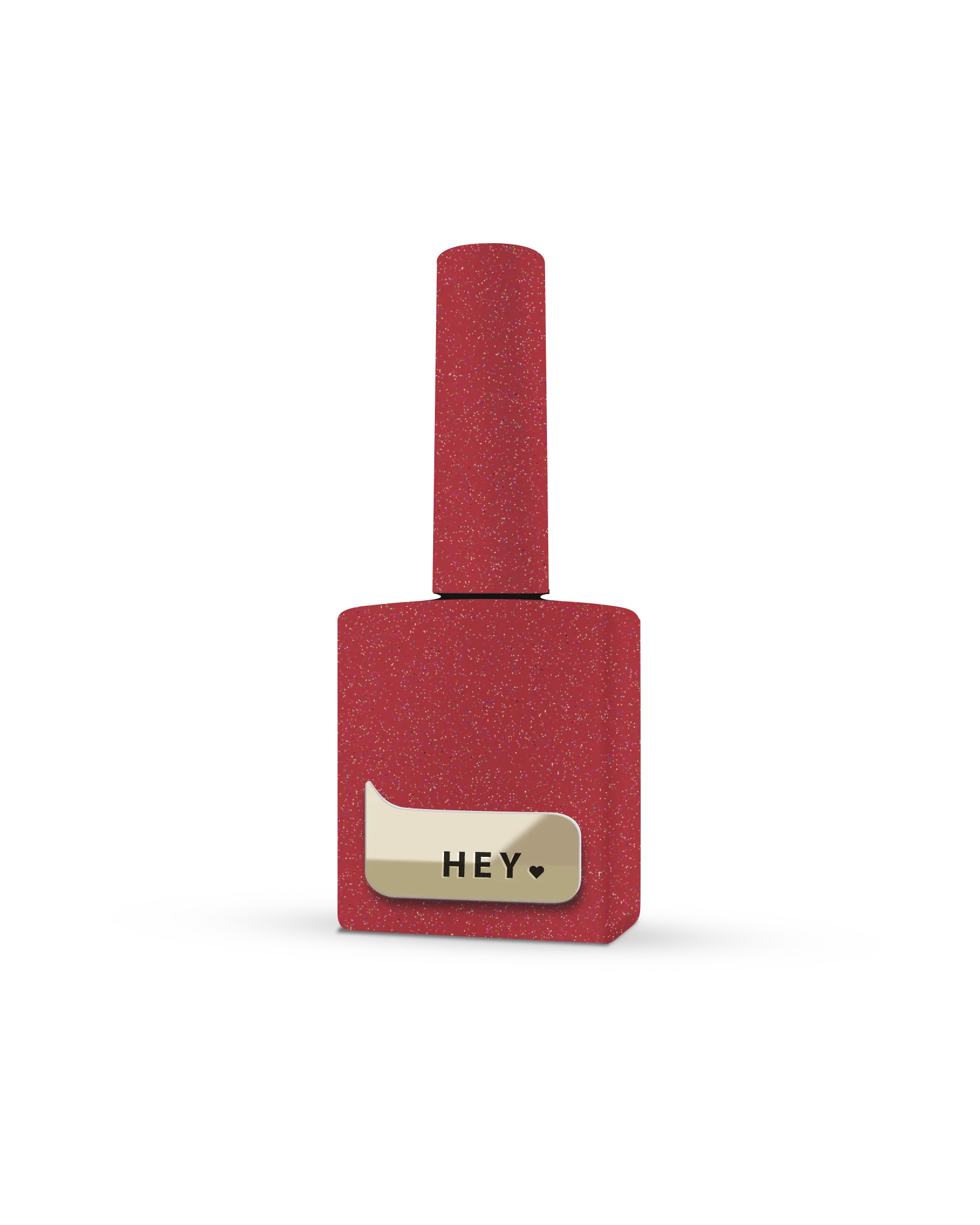 Esmalte semipermanennte INFRARED de la marca HEY🖤 es el esmalte rojo con brillo holográfico y partículas reflectantes.