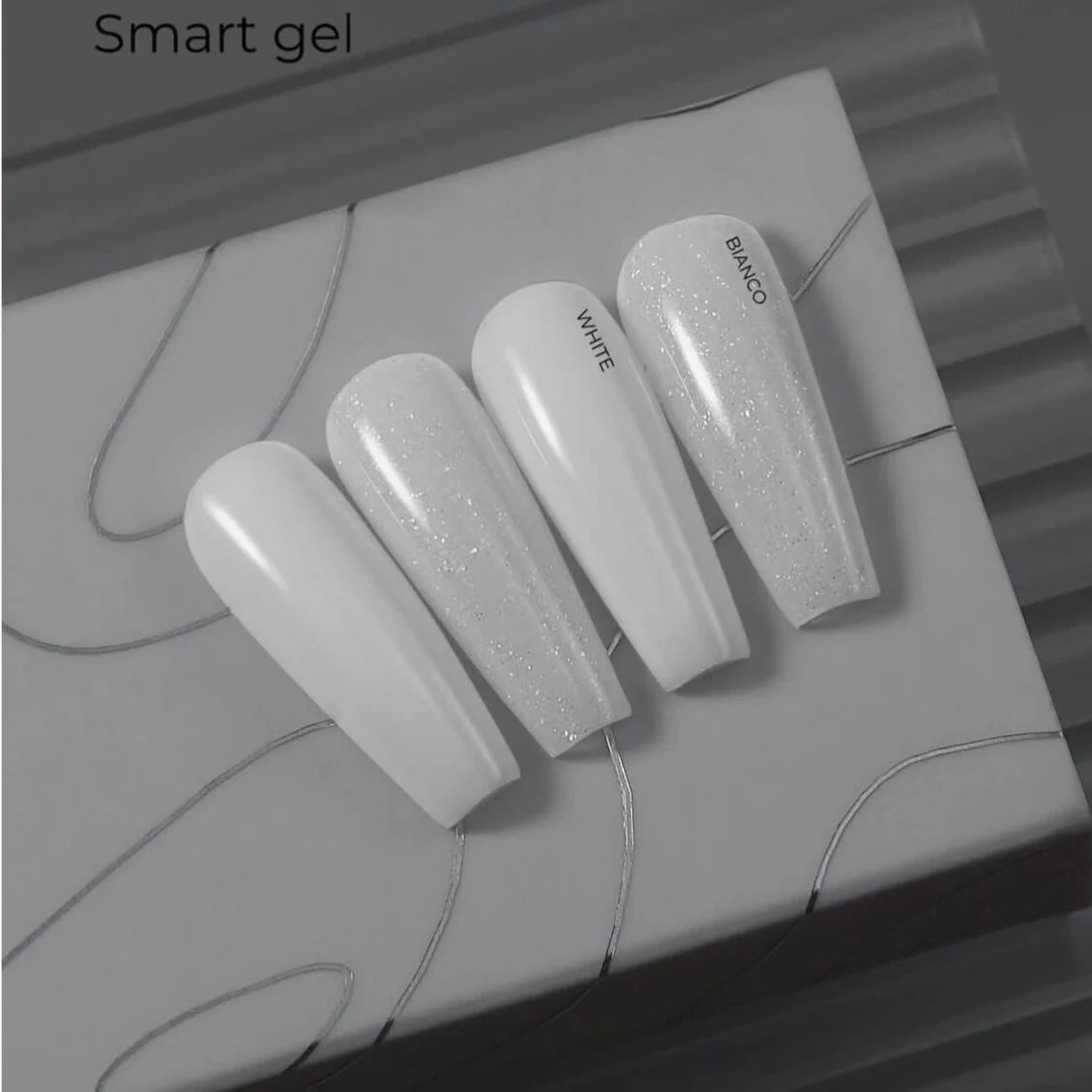 Gel constructor líquido HEY🖤 Smart Gel WHITE - líquido en bote. Permite realizar extensiones de uñas rápidas sin limar, fortalecimiento de uñas naturales, alineación y corrección de defectos de la placa de la uña. Color: blanco con purpurinas.